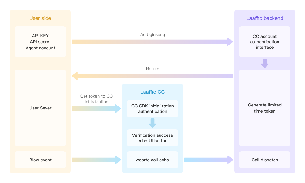 //1. In order to ensure the security of authentication information, the customer system backend service needs to implement SDK authentication capabilities and expose the interface to the customer frontend for use. The customer backend system access authentication capability document can be seen (https://www.laaffic.com/api/call/ccsdkAuthentication/)