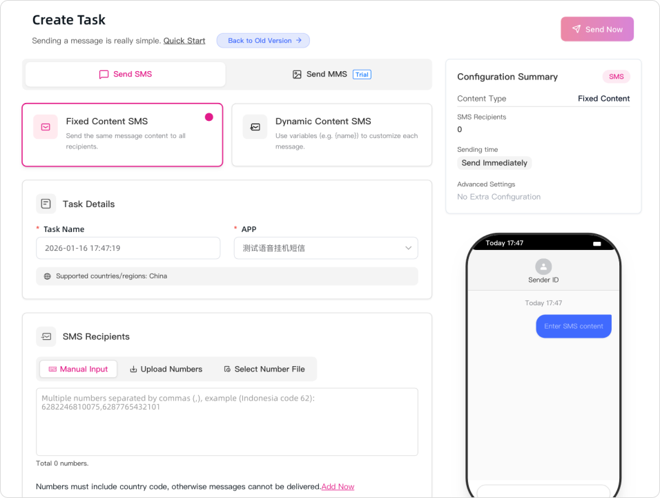 Supports both fixed-content SMS and dynamic-content SMS to meet diverse enterprise communication needs.
