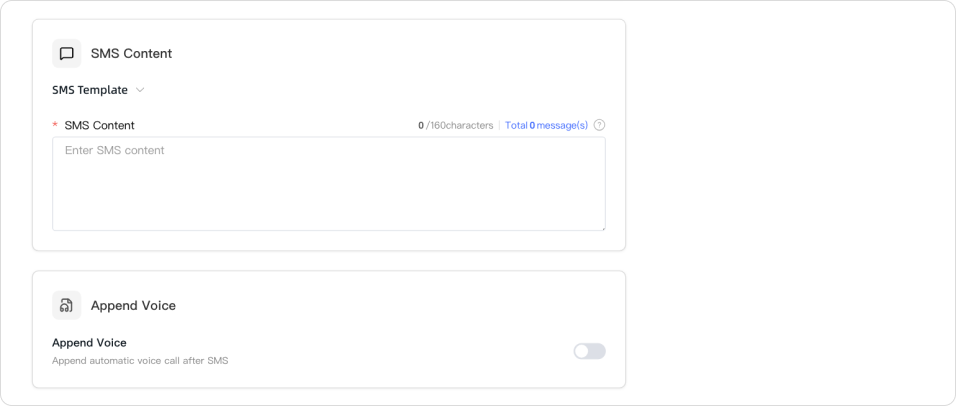 The following types are supported: a. Fixed-content SMS b. Dynamic-content SMS (supports inserting variables: fixed variables/custom variables)